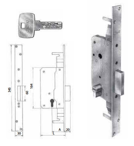 - Pestillo solo (rectangular) y dos pistones verticales (superior e inferior); a dos vueltas.
