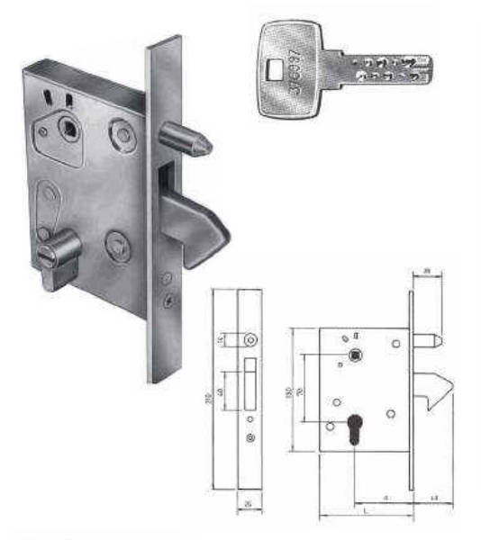 Serrure à mortaiser, appropriée pour portes coulissantes.