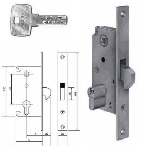 Serrure à mortaiser, appropriée pour portes coulissantes.
